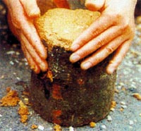 原木の木口に混合種菌を4~5mmの厚さに塗り、その上に別の原木を隙間のないようサンドイッチにする。(1500ccの種菌で直径15cmの場合、約50セット接種可能。)